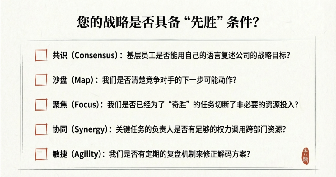 3. 从僵化到敏捷:“先胜”并非一成不变。定期的战略复盘与解码迭代,如同战前的“斥候”侦察,让组织能根据“敌情”“地形”的变化,动态调整“战法”,在变化中始终保持“先胜”的地位。