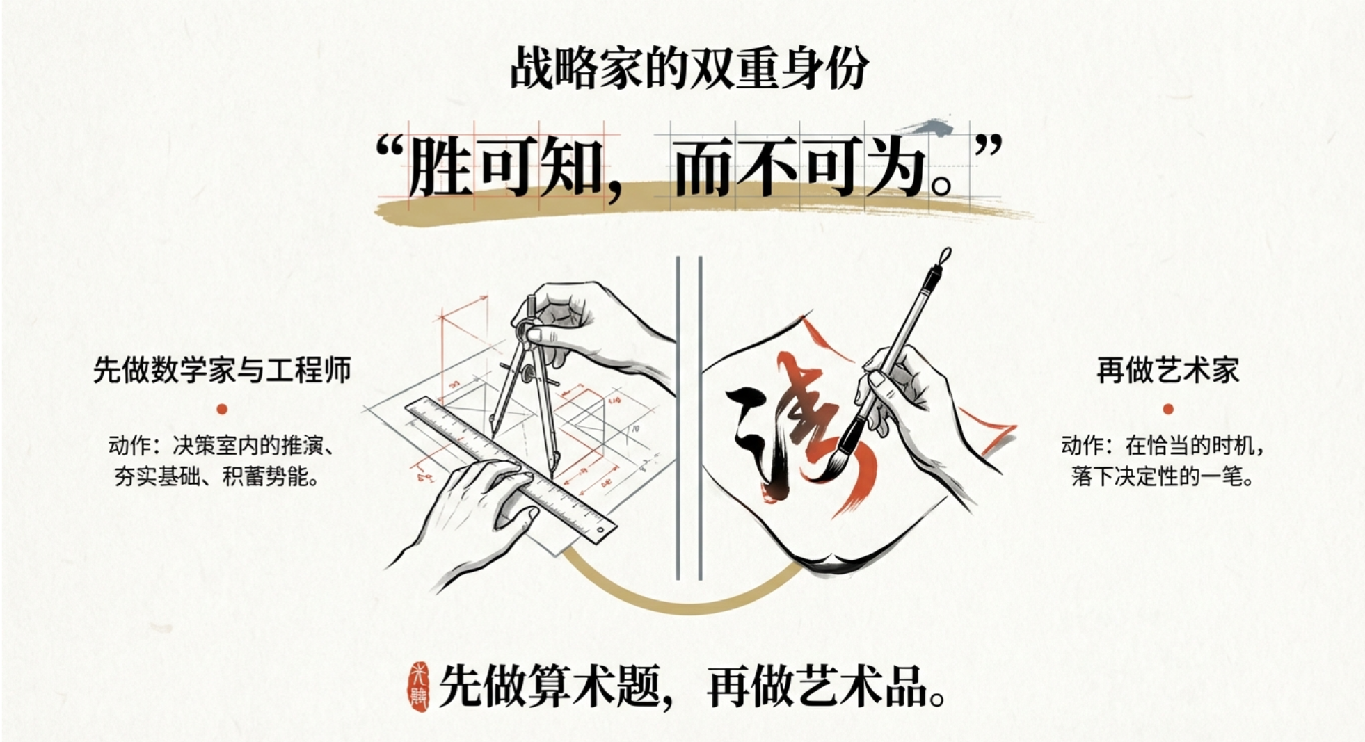卓越的战略家,永远是先做“数学家”和“工程师”,在决策室内反复推演、夯实基础、积蓄势能;然后才做“艺术家”,在恰当的时机,于市场的画卷上落下那决定性的、看似轻松的一笔。